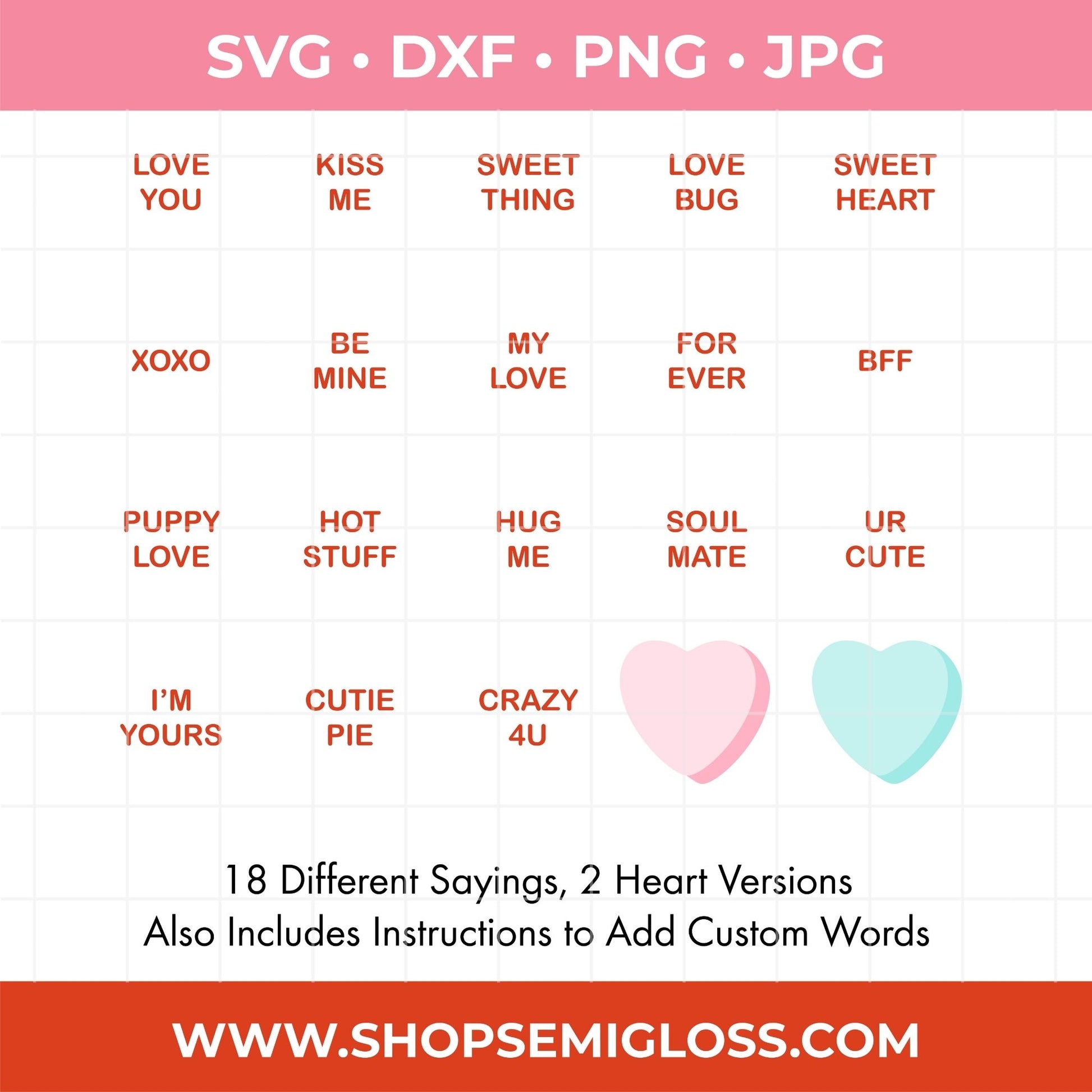 Make Valentine's Day crafts with this conversation heart SVG bundle. This set includes 18 fun phrases and 2 different heart styles - one for vinyl crafting and one for paper crafting. You also get a PDF guide with tips for adding your own custom text.